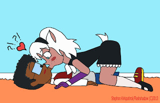Here we have a pic of Rokku-D's OC Elska Yakaru and my Fighting Ambitions OC Jun Sung, the wushu fighter, bumping and grinding their big, and curvacious booties together. ^///^ *drools*